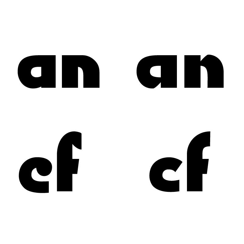 The result was a typeface that has many divergent characteristics: both straight and curved stems, both straight and curved stroke endings, ball terminals and so on. There are many thick strokes joining together (for example,